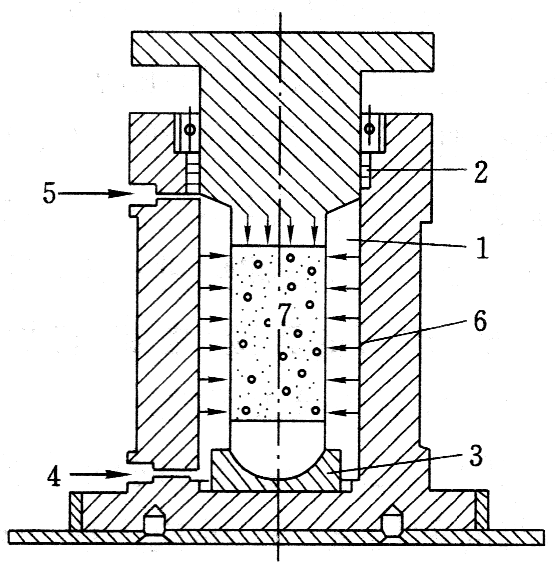 1—压力室;2—密封设备;3—球面底座;4—压力液;5—排气口;6—侧压力;7—试样