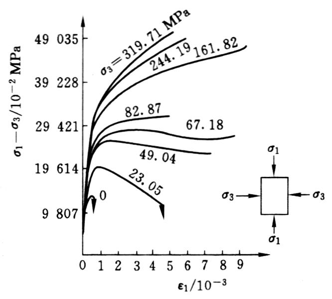 该强度在三轴压力试验机上测定。测定时先设定侧向应力σ2和σ3,再逐渐增加轴向应力σ1直至试件破坏。