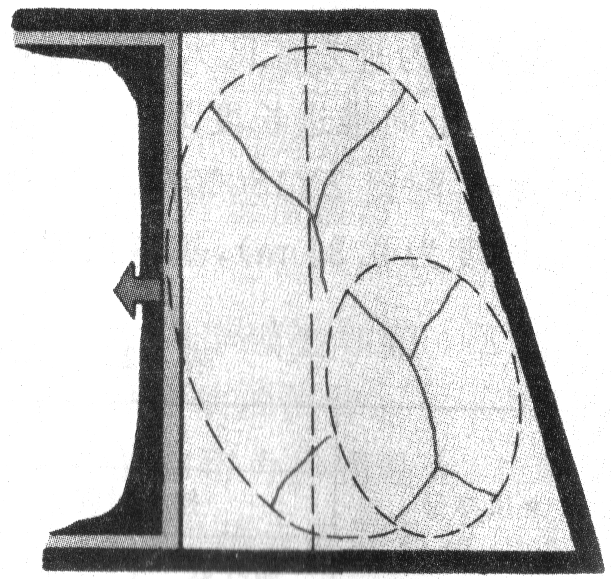 预防基本顶来压造成的事故:准确地判断基本顶来压的预兆,及时采取加强支护措施,保证支架的规格质量,保证支架阻力及支架稳定性;为了控制剧烈的基本顶来压,可将工作面与开切眼斜交,此时基本顶悬板呈梯形,破断边线仅部分与工作面相切(如右图),基本顶的破断将不至于造成工作面全面来压,而是呈局部来压。