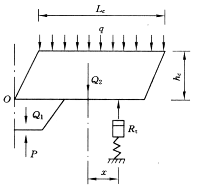初次来压时,在垂直方向,支架的支撑力 P 应使力学模型的以下四种力达到平衡状态: