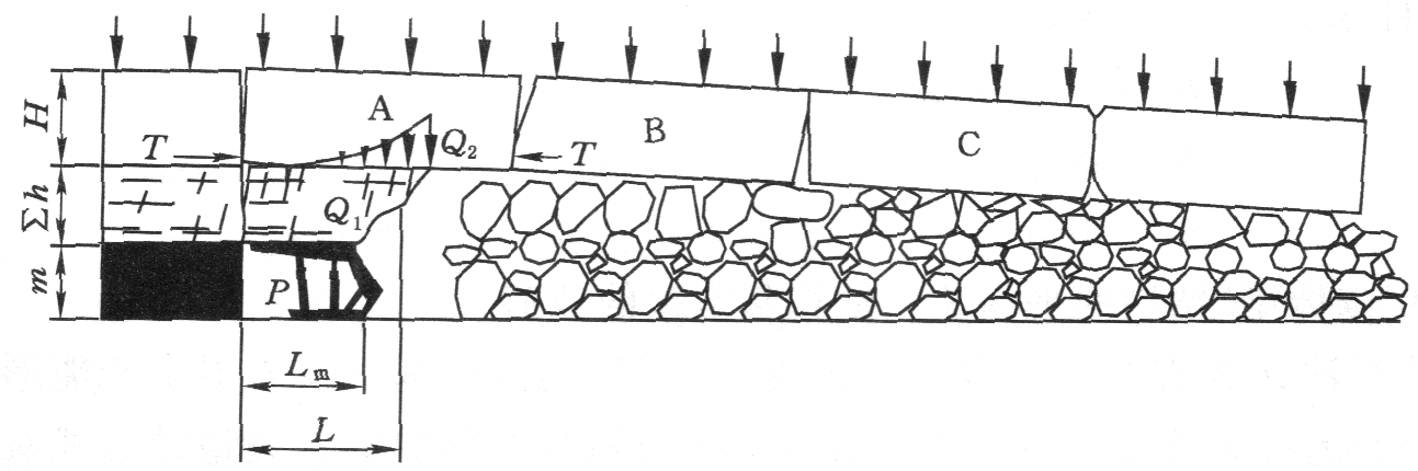 但以 O 点为轴,支撑力 P 形成的反力矩通常无法平衡由 Q2 所形成的力矩,因此基本顶岩块的回转在一定程度上是不可避免的。