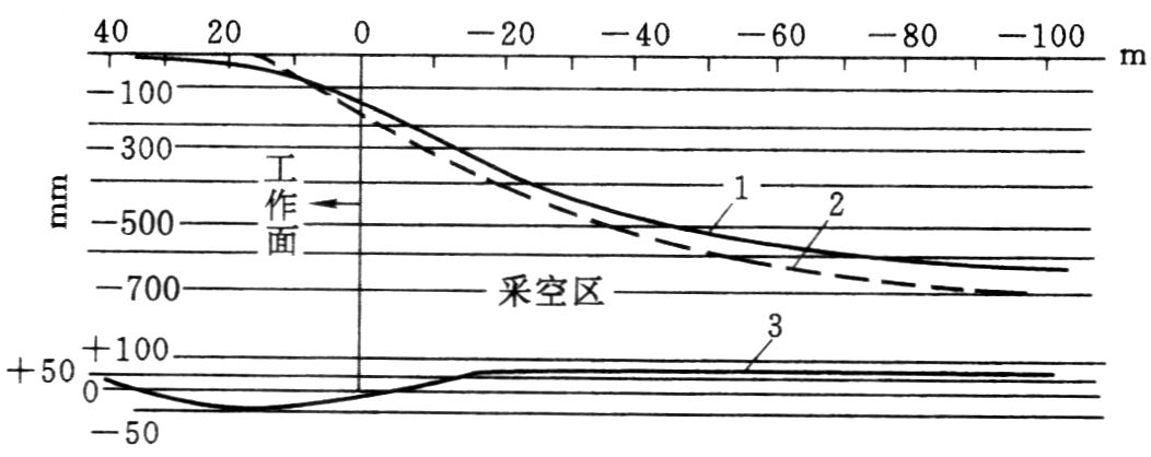 1—顶板绝对下沉曲线;2—顶底相对移近量曲线;3—底板鼓起曲线