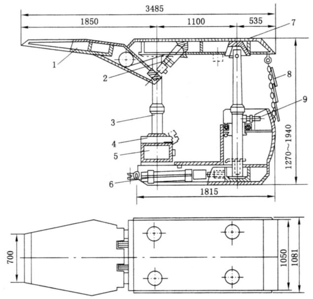 一般情况下,金属顶梁是刚性结构。支柱则常由两节(即活柱和底柱)组成。它们之间的伸缩关系形成了支柱的可缩性。