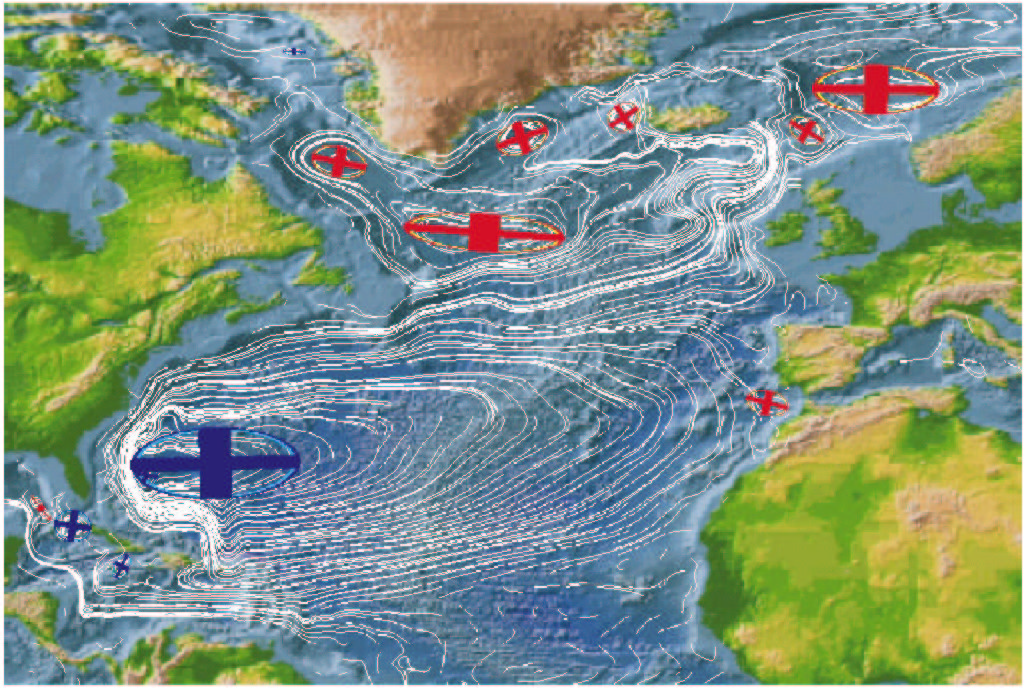 流线和椭圆表示漩涡,蓝色和红色椭圆